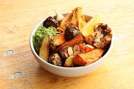 Légumes rôtis, houmous, avocat, pickles maison, riz complet
